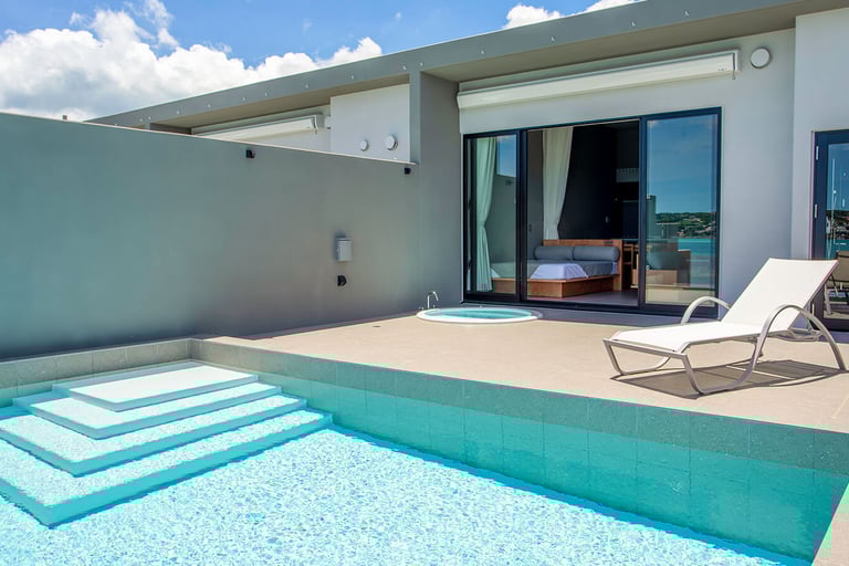 全客室、海と繋がるようなインフィニティプールやジャグジー付き。広々としたリピングやお風呂からもエメラルドグリーンの海が眺められ、南国ムード満載。