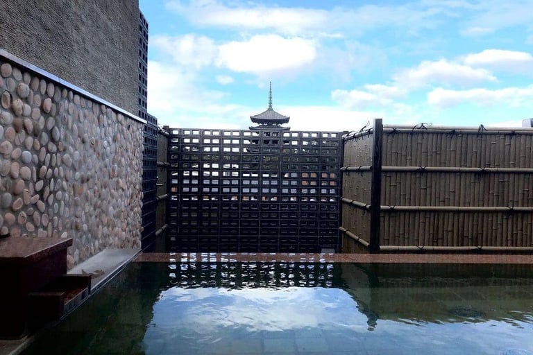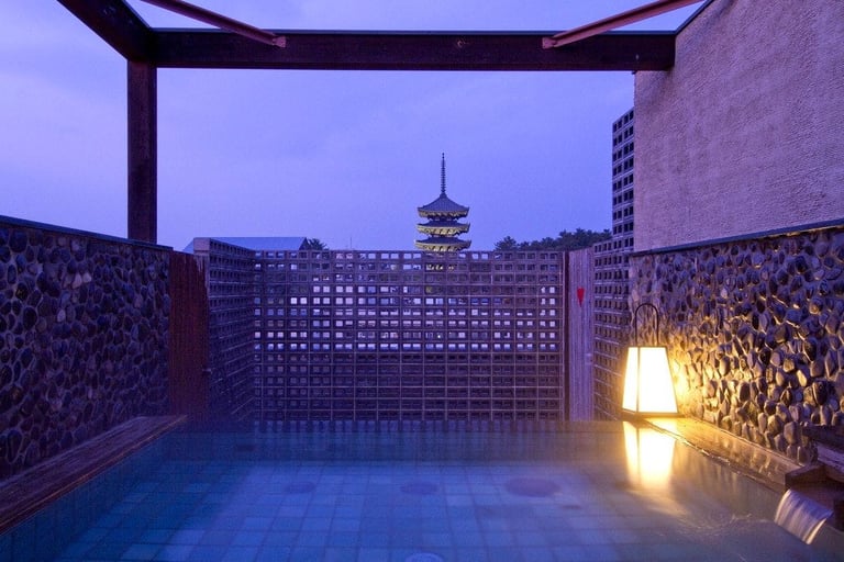 目の前に興福寺、夜にライトアップされる幻想的な五重塔を眺めながら入る露天貸切風呂は贅沢の極み。