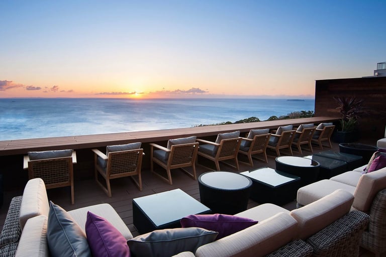 “紺碧テラス“では海と大空を独り占め。早朝には相模湾の水平線から上がる雄大な日の出を、夜はオープンエアラウンジとしてBARで作るカクテルをテラスで楽しめます。