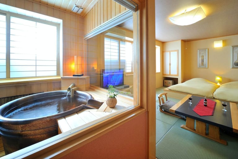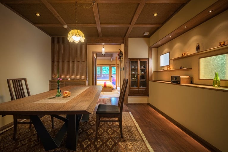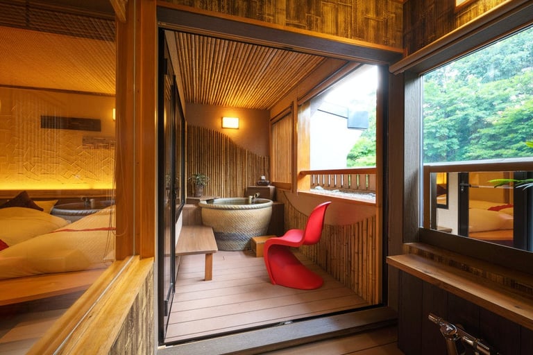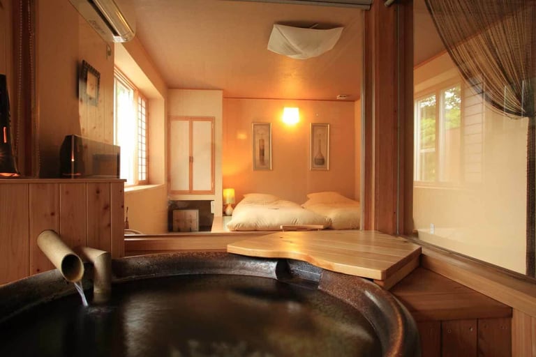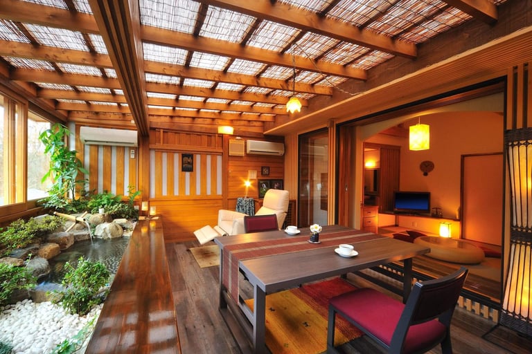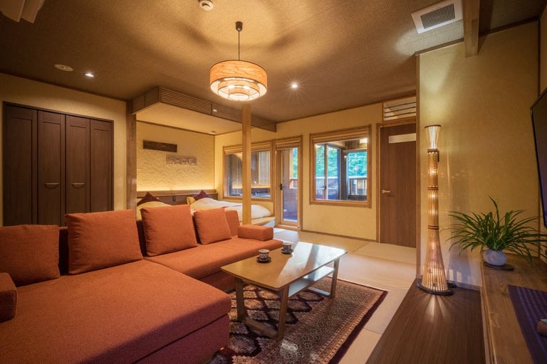信楽焼の陶器露天風呂やダイニング、和風庭園付きの和モダンな部屋から、高原の高級リゾートを彷彿させるコテージ風テラスがある部屋など、旅のスタイルに合わせて好みの部屋を選択。