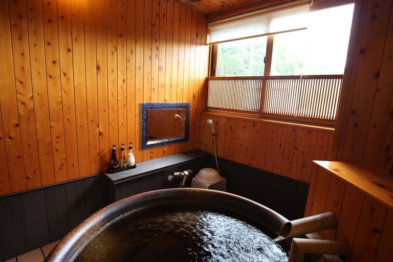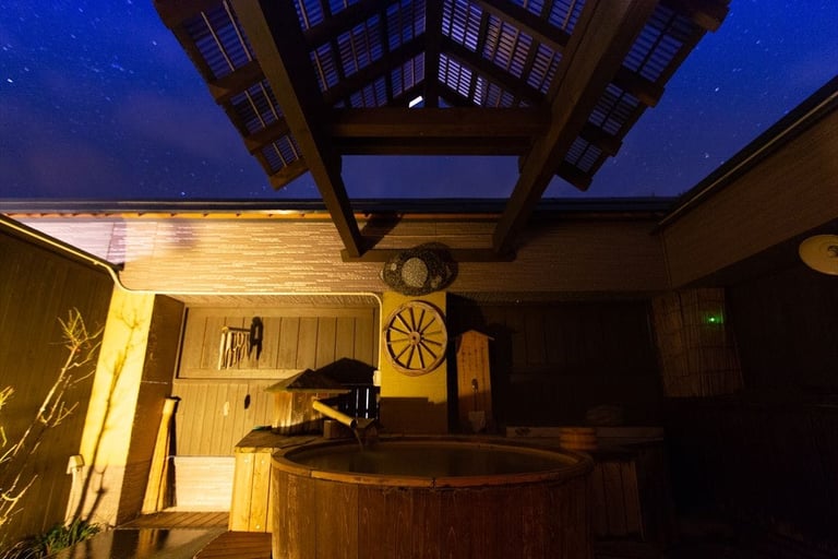 寝湯付きの信楽焼の露天風呂、ランプの灯りが幻想的な露天風呂、無垢材の木のぬくもりを感じられる4つの内湯を完備。他にも、湯上がりラウンジ付きの貸切露天風呂もあり、天気がよければ満天の星に出会える贅沢さ。