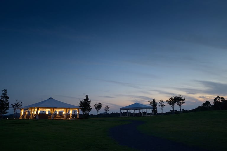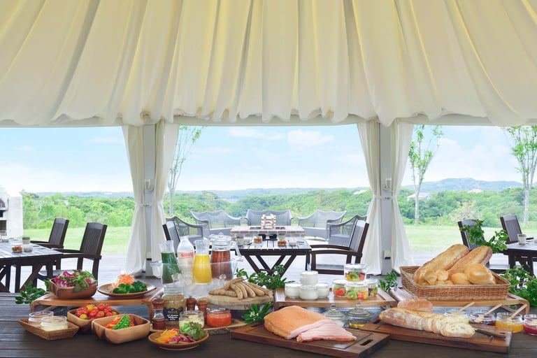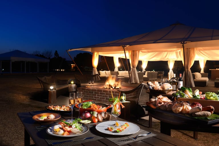 360度大自然に囲まれた開放感あふれるオープンテントで、朝は芝生の上で緑を望みながら味わう「グランピングブレックファスト」、夜は満天の星空の下で堪能する「グランピングディナー」が楽しめます。