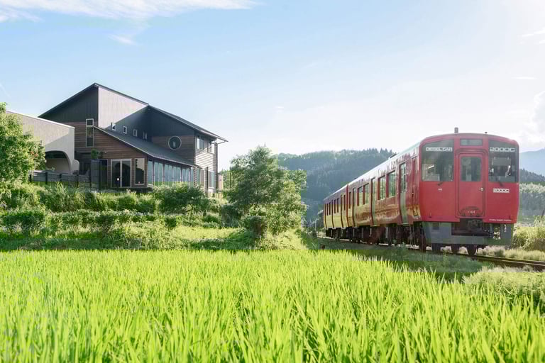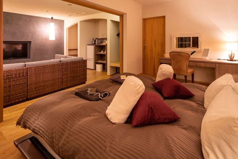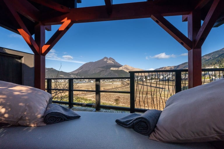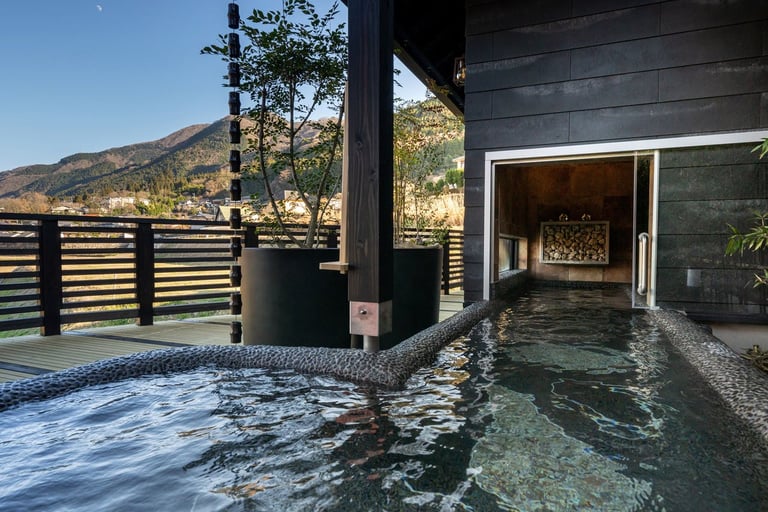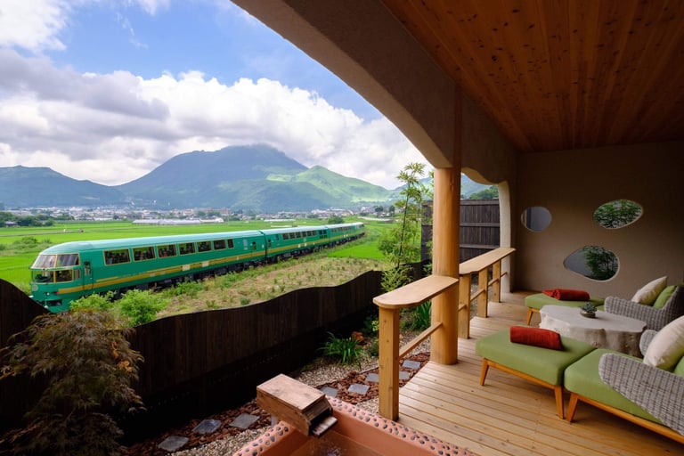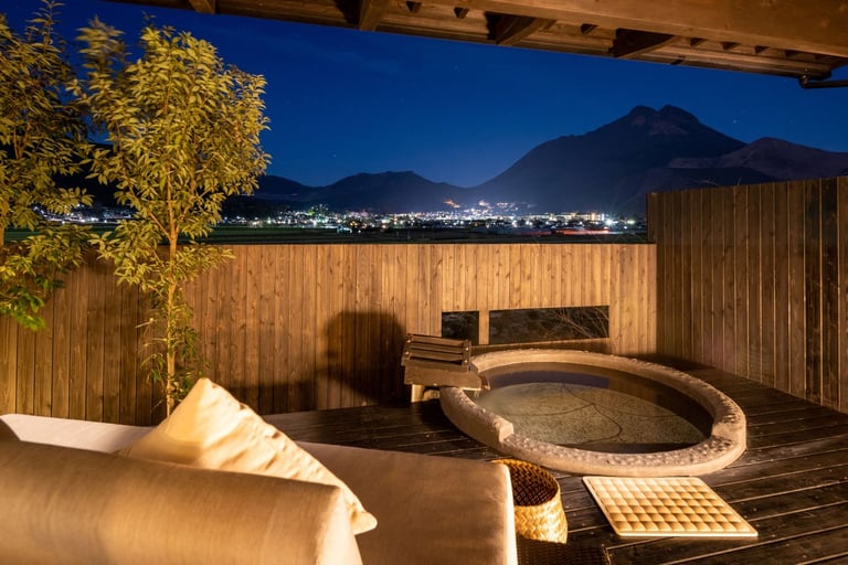 洞穴をモチーフにした部屋、天井が高く開放感のあるツインルーム、内湯と露天が直結の約5mのパノラマ風呂のあるシックな客室、3タイプを用意。どの部屋からも田園を駆け巡るクルーズトレイン“ななつ星“を眺められ、活火山由布岳の壮大な景色を一望。夜は満天の星空の下、源泉掛け流しの湯に癒される非日常のひと時を。