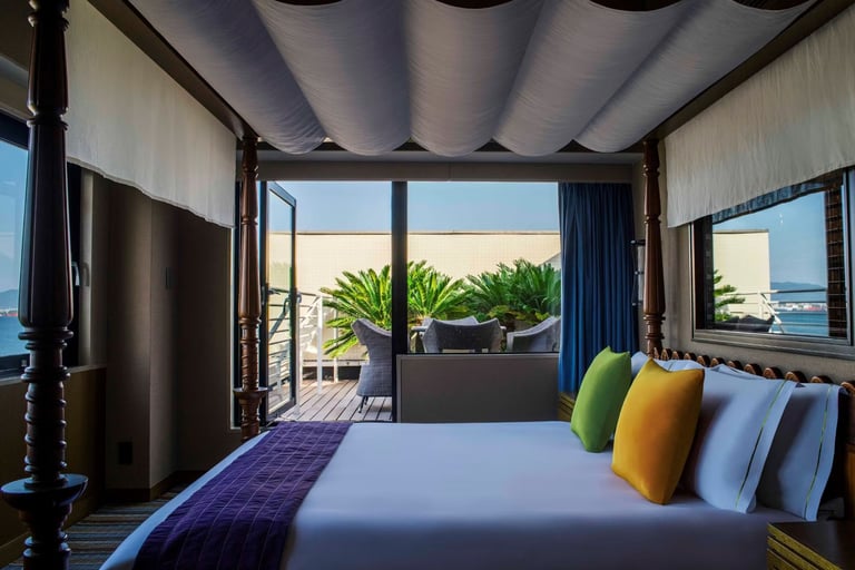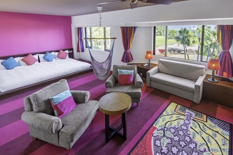 全室オーシャンビューの客室には、メキシコの建築家・ルイス・バラガンの世界観を取り入れたカラフルで心弾むインテリアが広がります。