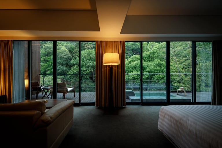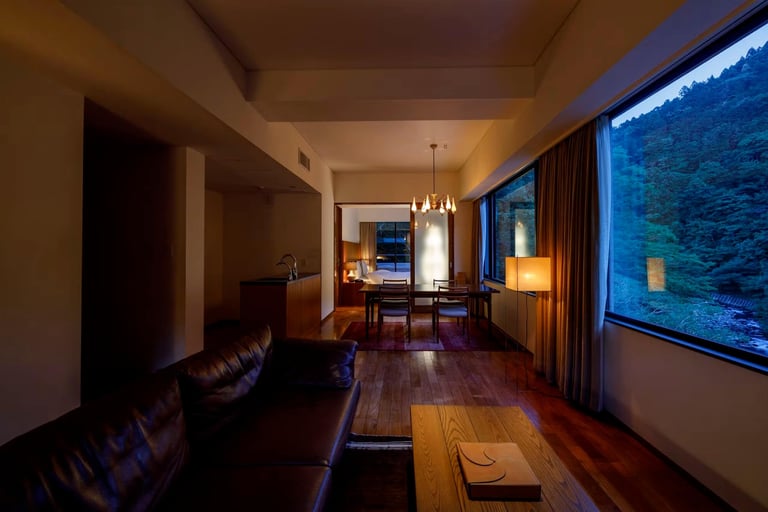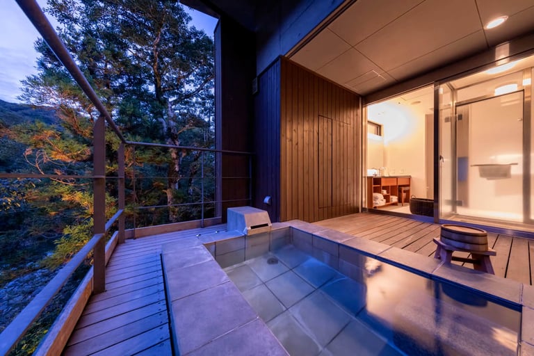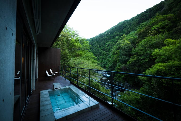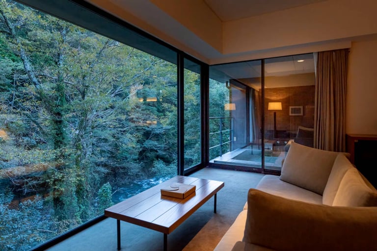 全客室リバービュー、テラスには源泉掛け流し露天風呂がつく贅沢仕様。自然と一体にあるような空間で、大きな窓からは緑が眺められ、まるで森林浴のような気分に。