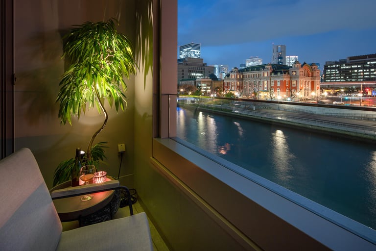 客室の窓からは、中之島を流れる川の景色が広がり、時間帯によって変わる水面の光を眺めながらゆっくり過ごせます。 カフェのような空間には、ゆったり座れるチェアと集中できるデスクも配置され、観光だけでなくワークにもぴったりです。 屋上のルーフテラストップでは、川風を感じながらカクテルを楽しむことができ、日常では穏やかなひととき。 都市のリバーサイドならではの開放感と静けさが漂います。