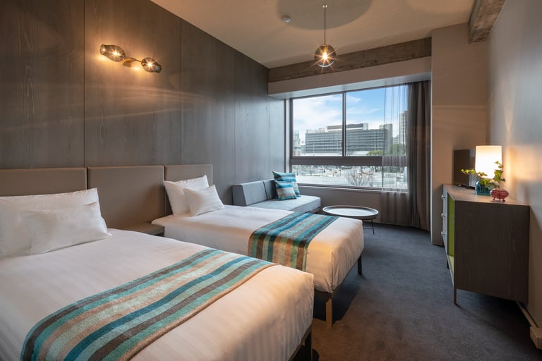 客室は、中之島の河川を望むリバービューから、モダンなインテリアが並ぶ“クリエイターの部屋”のような空間まで、それぞれに個性が光ります。 全客室にBluetooth対応の「Panasonic i-X」シャワールームを備え、好きな音楽を流しながらくつろげるのも魅力。 灯りや音が調和する落ち着いた雰囲気の中、自分だけのリラックスタイムを楽しめます。 気分や目的に合わせて自由に過ごせる仕立てです。