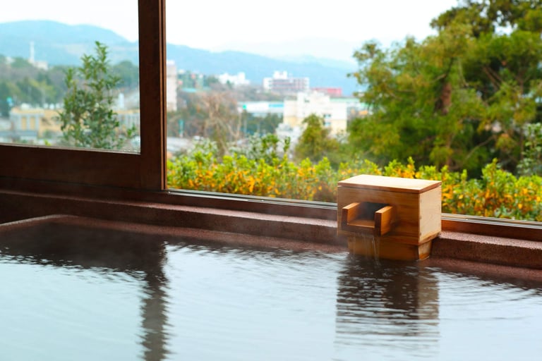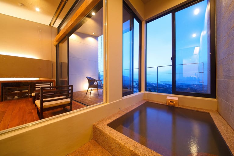 テラスからは別府の絶景が眺望でき、客室風呂では"美肌の湯"とも呼ばれる硫黄泉が湧く堀田温泉の湯を好きなだけ味わえます。