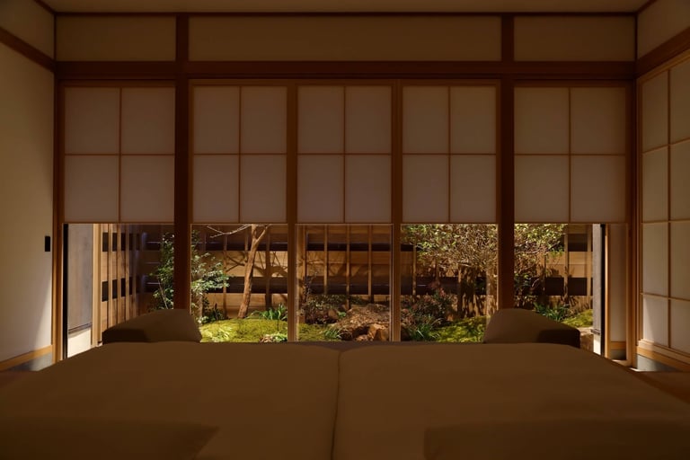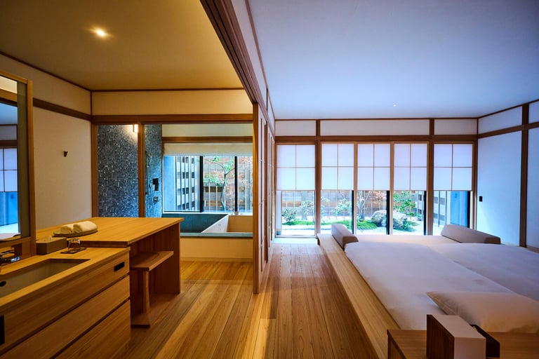 客室は、箱庭を楽しめる「庭」、夕涼みができるバルコニーを有した「涼」、3名以上の宿泊に最適なメゾネットタイプの「庭涼」「空涼」の4種類。