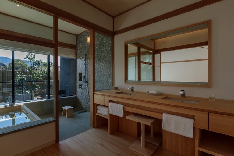 杉・檜・福光石などの天然素材を活かした客室には、木のぬくもりを感じる檜風呂を完備。数寄屋造りの雰囲気が残り、まるで家にいるかのような心地良い空間です。