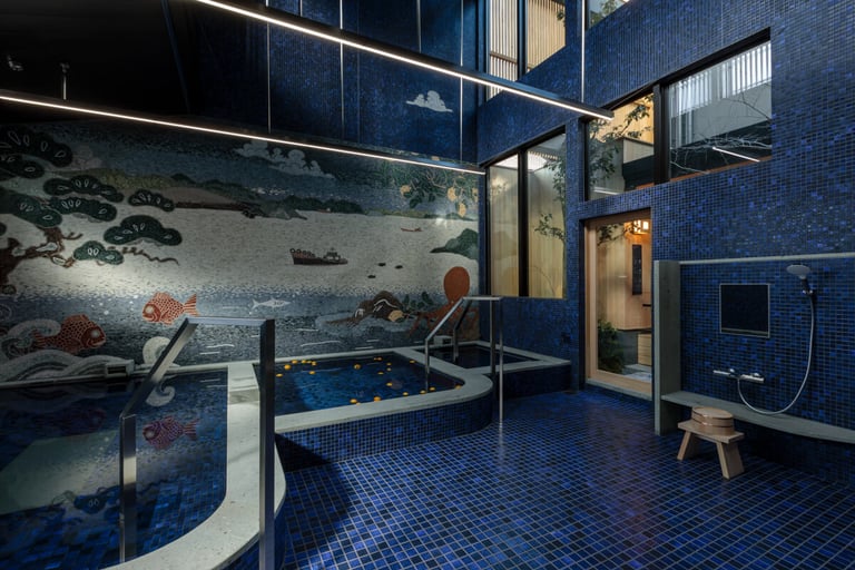 Azumi Setodaの目の前には、港町の銭湯”yubune”が。浴室には、瀬戸内の島々や豊かな海と生き物をモチーフにした斬新で美しいタイル壁画があり、客室風呂とは違った湯浴みが楽しめます。変わり湯やサウナも完備し、滞在中は何度でも利用できるのも魅力。ゆったりとした湯船で足を伸ばし、日頃の疲れを解きほぐします。