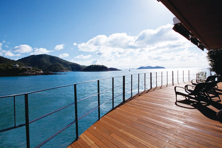 リゾート感漂う開放的なデッキテラスでは青い海が一望でき、仙酔島や白波を立てて進む船を眺めながら思い思いの時間を。