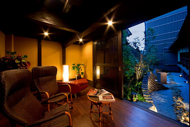 中庭を望むリラクゼーションルーム“坐忘“では、低反発マットレスと岩盤ストーンで作られたチェアがあり心と身体を同時に癒せます。