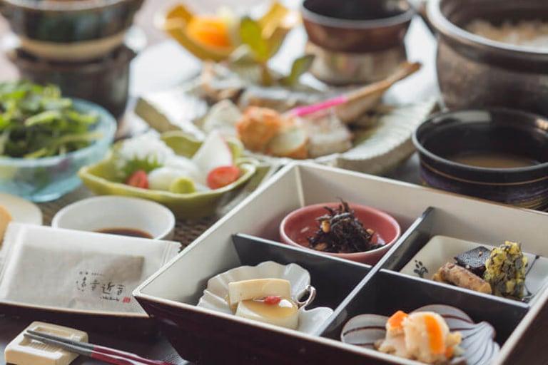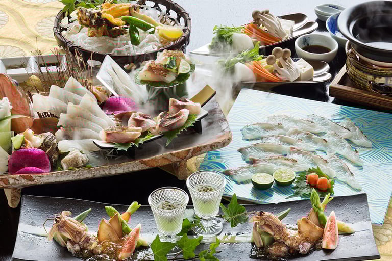 器や盛り付けにもこだわった夕食は、目でも楽しめる会席料理🍽 瀬戸内海でとれた黒鮑料理や虎魚料理、名物の“鯛釜飯“がいただけます。