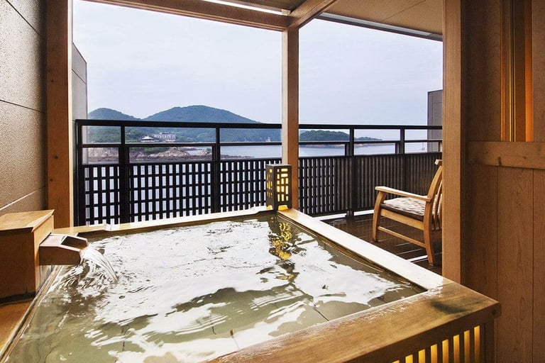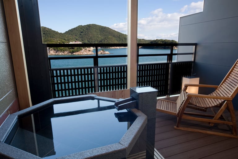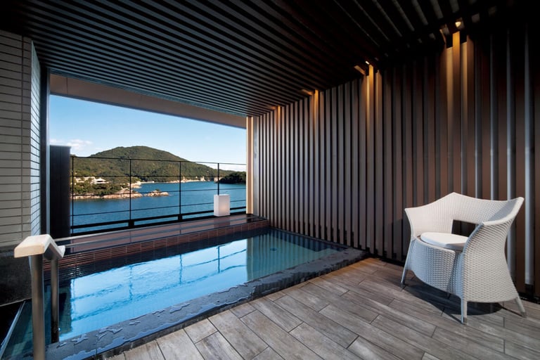 和モダンな落ち着きのある雰囲気で、温泉露天風呂付きという贅沢さ。デッキテラスに設えられた露天風呂では、潮騒をBGMに優雅な湯浴みを堪能。