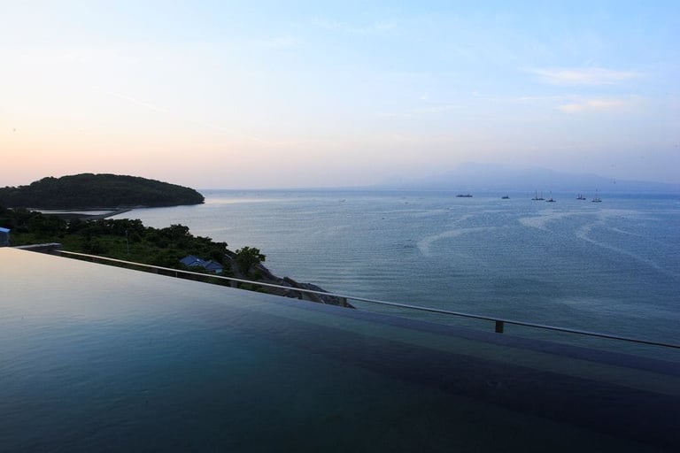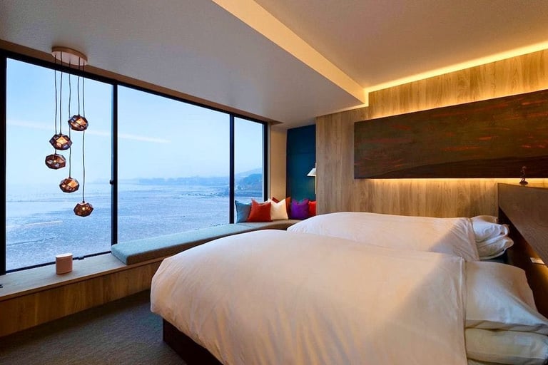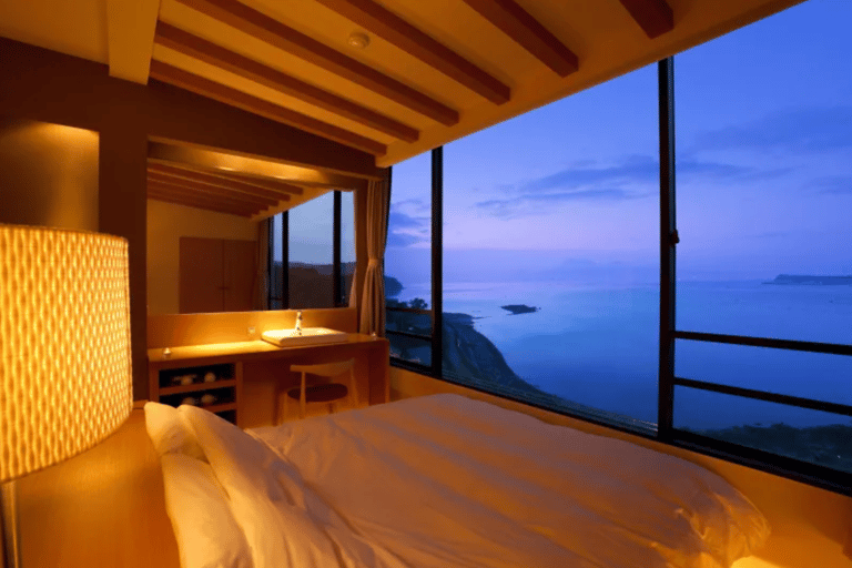 一面全てがガラス窓でできたパノラマビューの客室では、まるで映画のスクリーンで絶景を眺めているよう。雄大な海と空が目の前に広がり、宙に浮かんでいるような感覚が味わえます。