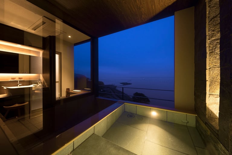 もっとも海に近い場所にある露天風呂付き客室は2部屋。6名で宿泊してもゆったりとできる広い室内で、目の間に広がる有明海の景色を独り占め。爽やかな波音と潮風に包まれる至福の湯浴みを。
