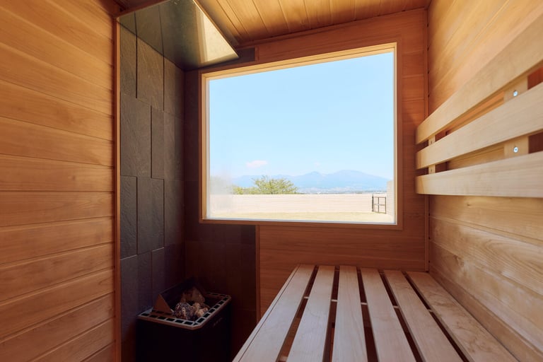 一部ヴィラでは、国産ヒノキの香りに包まれたプライベートサウナも体験可能。