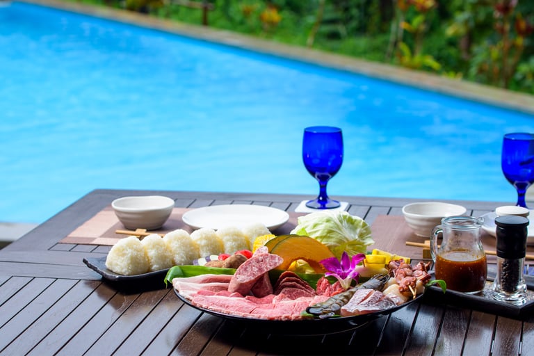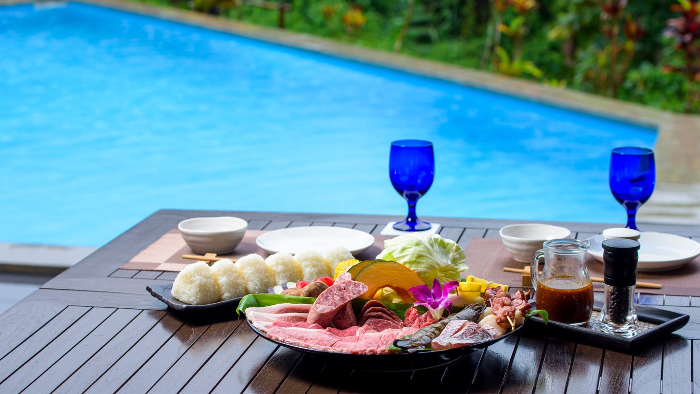 プライベートプールサイドのアウトサイドリビングでは、地元食材を自由に焼く BBQ も楽しめ、素材の旨味を味わえるのも魅力の 1 つ。
