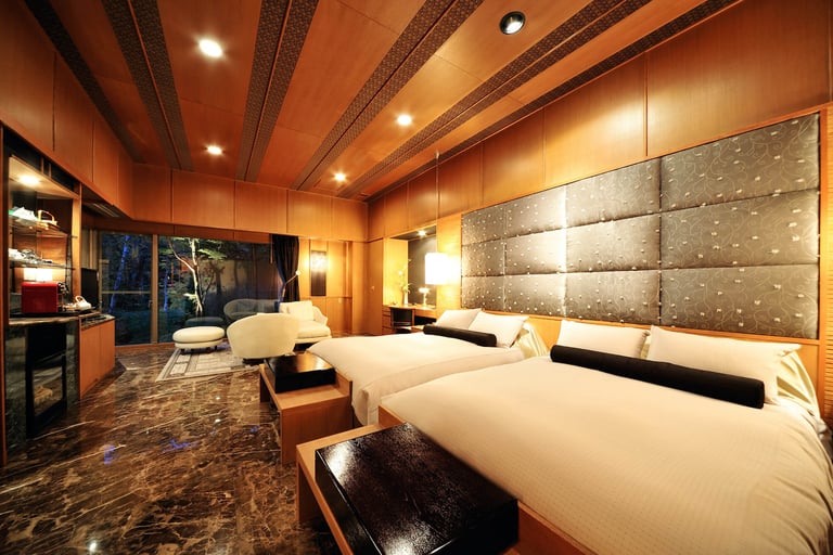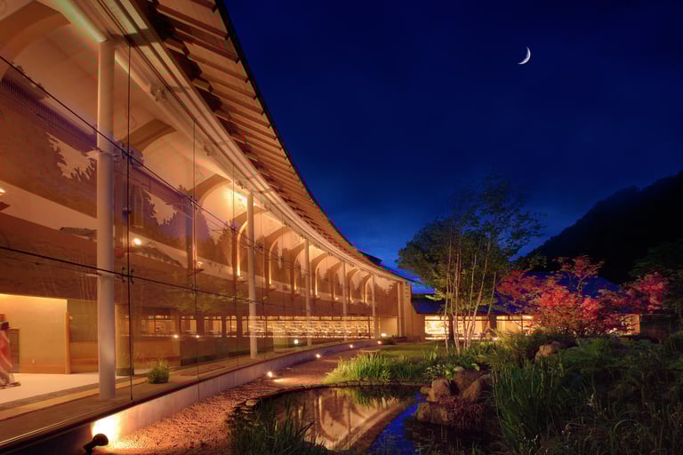 高さ約8mの曲面廊下が象徴する現代建築美も圧巻で、世界に認められた「和のリゾート」の名にふさわしい非日常が広がります。
