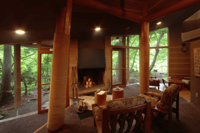 ロビーに続く広大な庭園からは、雄大な谷川岳の景観を一望。庭園の奥へ進んでいくと、周囲を木々に囲まれた暖炉が特徴的な“読書ルーム“が現れ、ゆったりとした時間を過ごせます。
