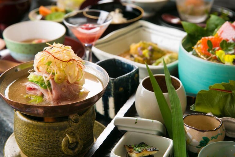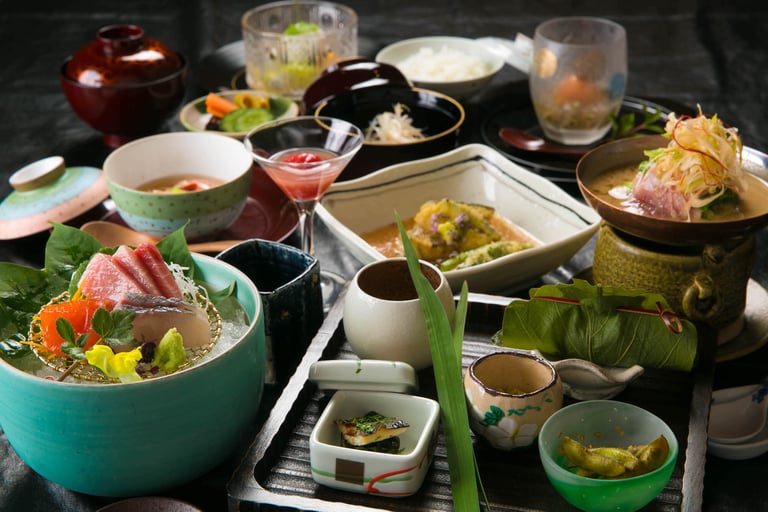 夕食は群馬県産の旬食材を活かした創作和食を提供。素材選びから盛り付け、だしに至るまで丁寧に仕立てられ、前菜から岩魚、上州牛まで旬の逸品を堪能。掘りごたつ式や囲炉裏のある個室など、多彩な空間でゆったりと食事を楽しめます。