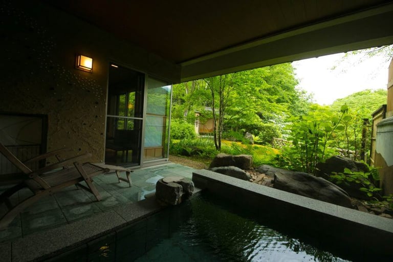 総敷地面積5万坪にわずか18室のみという贅沢さ。全室に源泉かけ流しの専用露天風呂を備えた上質な空間です。
