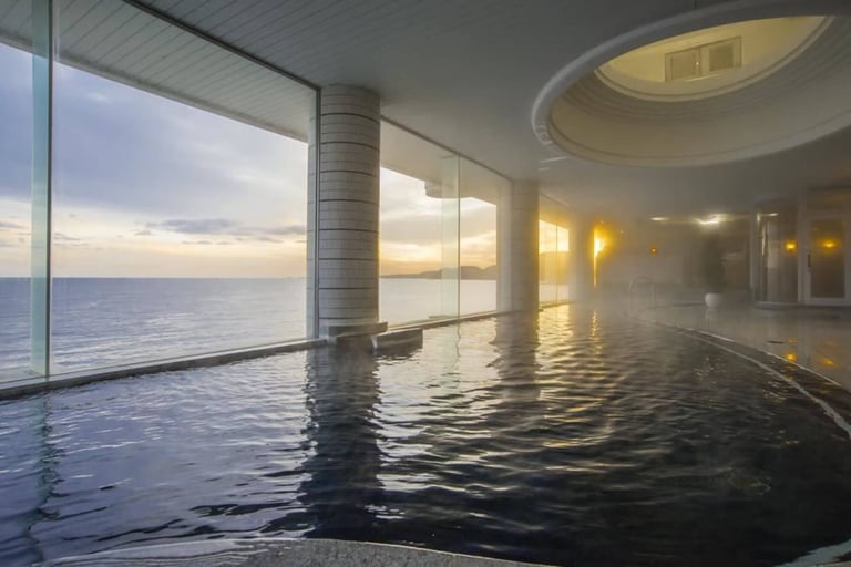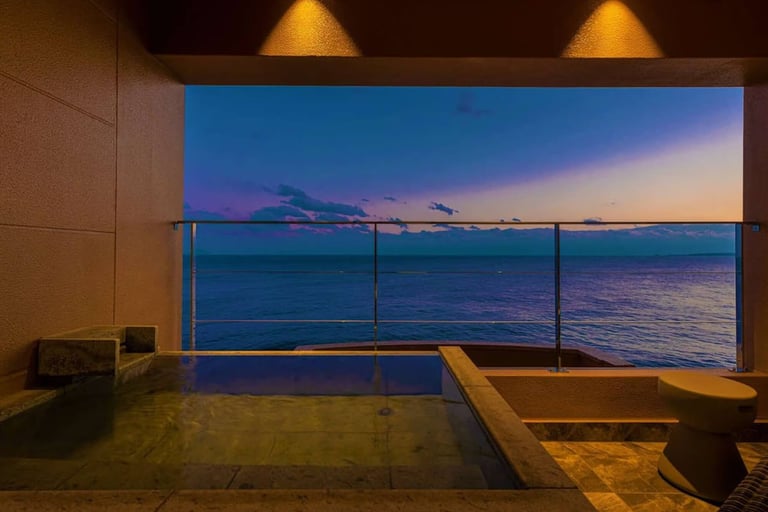 絶景露天風呂付きの展望大浴場では、日の出を眺めながらの朝風呂、海と空が赤く染まる夕焼け、夜は一面に広がる天然プラネタリウムなど、一日中絶景を満喫できる贅沢さ。露天風呂では海と繋がっているような一体感が。