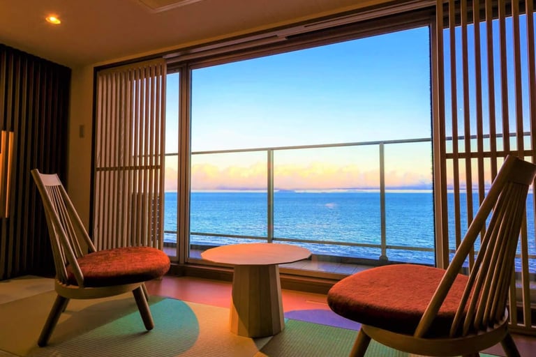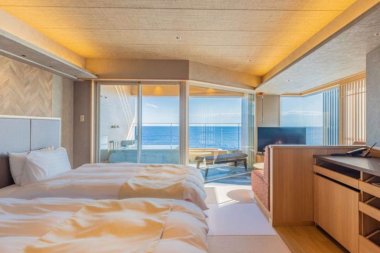 和の落ち着きある客室は、絶景を望む全室オーシャンビュー。
