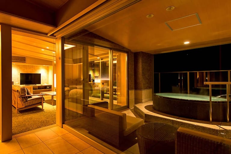 湯めぐりが楽しめる”湯っくら”は、下には内湯、上には岩風呂があり、珍しいメゾネット構造のお風呂専用棟。最上階にある絶景露天風呂や、山側の落ち着いた露天風呂は貸切で利用でき、プライベート空間でゆっくりと寛げます。