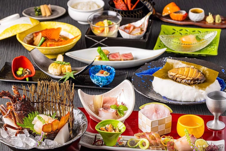 夕食は、季節替わりの創作料理を堪能🍽 地元・稲取の名物”金目鯛”や、厳選された素材、新鮮な海の幸をふんだんに用いた絶品がいただけます。