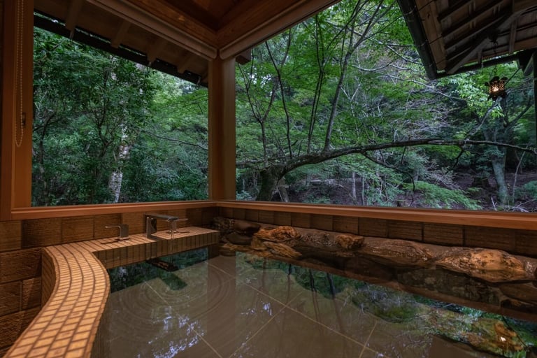 地下5mから湧き出る若宮温泉は、"美肌の湯"として知られるラドンを豊富に含むと湯で、夜は原始林の緑のライトアップを眺められます。