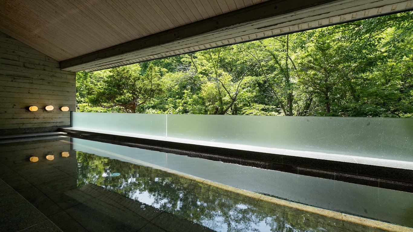 大浴場は渓流沿いに広がる自然の眺めと、川の音を同時に楽しめるのが魅力。