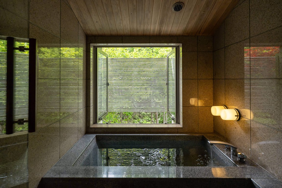 冬は雪景色を眺めながら入浴ができ、窓を開ければ外の空気が心地よく流れ込みます。