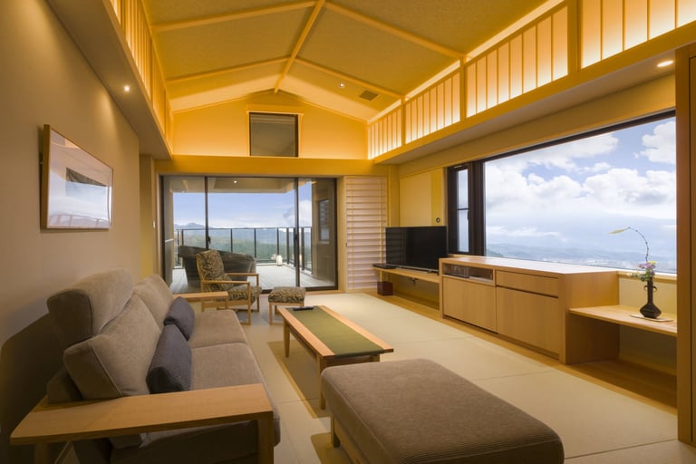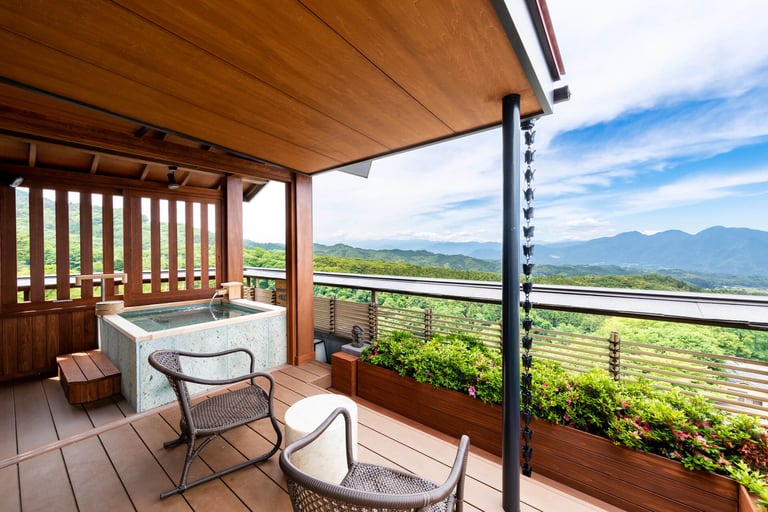 20平米の広さのあるテラスに露天風呂のある部屋は、天井が高く、大きな窓から伊香保の大自然を一望。“ロクシタン“のアメニティーを使用しているのも魅力。最上階には、露天風呂と庭園付き、上州の山や前橋の夜景が満喫できる豪華な特別室も。