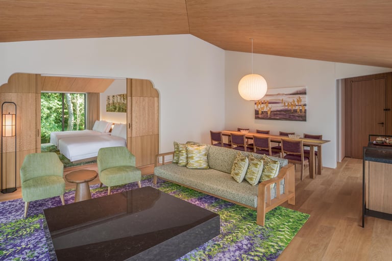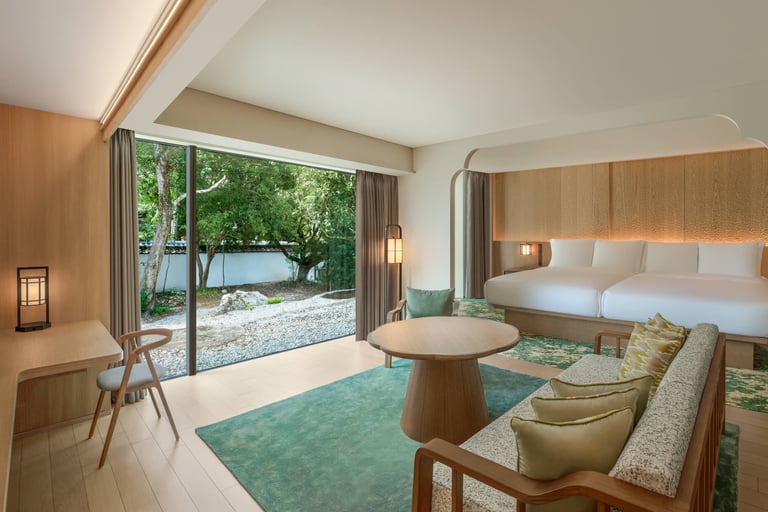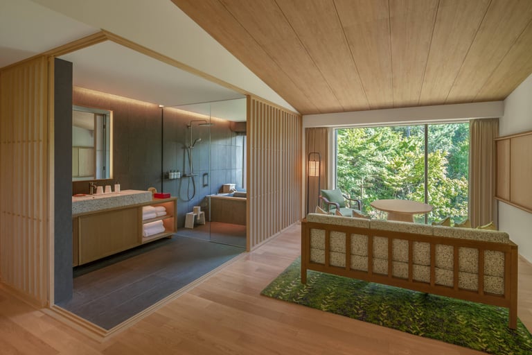 日本を代表する建築家・隈研吾の設計したラグジュアリーホテルは、約9,000坪の敷地に8棟の建物が立ち並ぶ“街並み”のような風景。