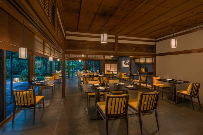 ダイニングは、1922年に建造された”奈良県知事公舎”の客間を修復・再生。庭園が屏風のように広がり、奈良の象徴的な燈籠をイメージした照明や旧知事公舎のエントランスをモチーフにしたテーブルなど、大正時代の趣を感じられます。