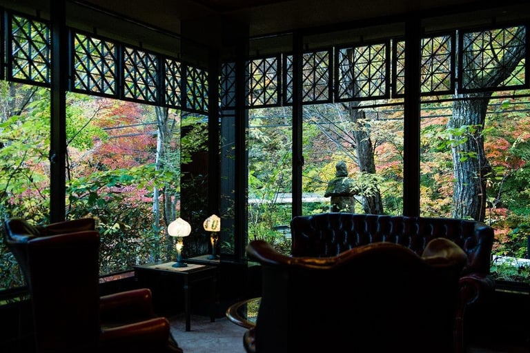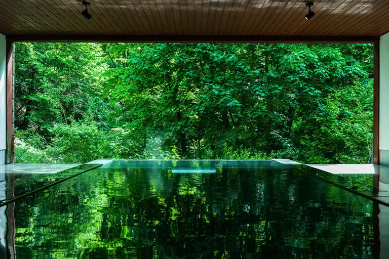 ロビーは重厚な雰囲気が漂い、半露天風呂"雪月花"からみえる森に溶け込む絶景は圧巻です。