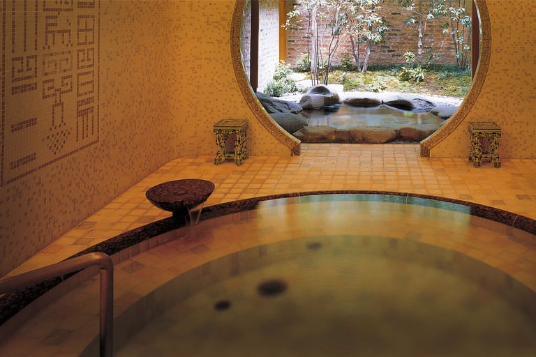 湯船や天上壁までも総檜で造られた"吉の湯"、石造りの円形が特徴の和モダンな雰囲気の"福の湯"にはそれぞれ露天風呂がついており、贅沢な時間を過ごせます。