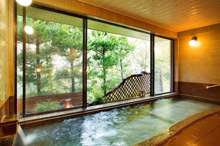 貴重な天然ラドンを含んだ温泉は、発汗作用と新陳代謝を高め、疲労回復や神経痛などに効果的。窓一面に広がる自然豊かな緑を眺めながら、寛ぎのひと時を。