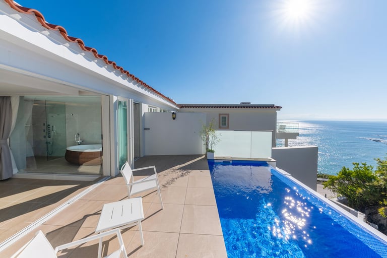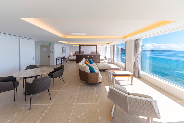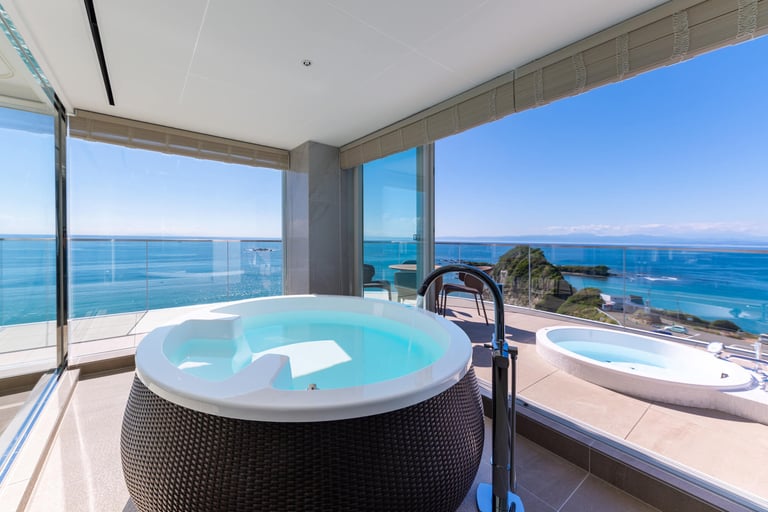 屋外プライベートプール付き、屋外ジャグジーがあり富士山を眺められる部屋、メゾネットタイプ、ルーフトップテラススイートなど、朝日や夕陽に染まるオーシャンビューの絶景を望む非日常空間。