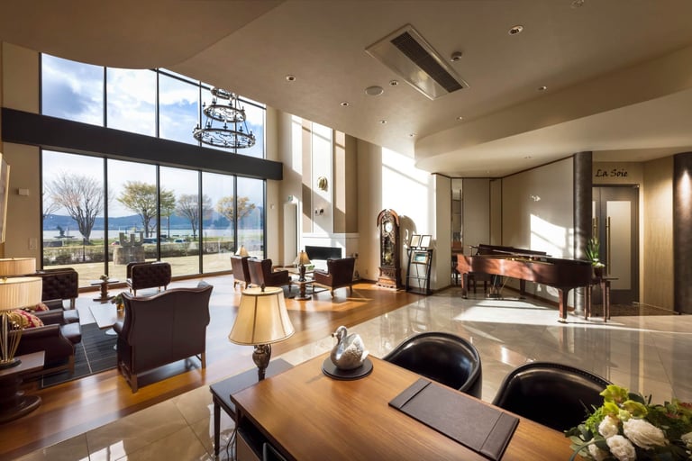 湖畔の洋館らしい個性的な建物と、暖炉や振り子時計が置かれたクラシカル感漂うロビー・ラウンジがお出迎え。
