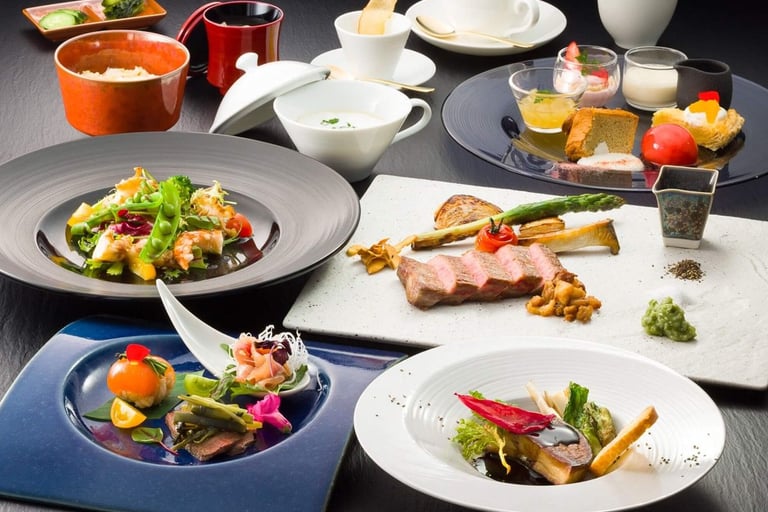 メインダイニング”La Soie(ラソワ)”では、地元食材を大切にした創作フレンチを堪能🍽 美容と健康にも効果的な”シルクパウダー”を用いた逸品、デザートワゴンサービス、信州産ビバレッジがいただけます。創作信州フレンチをはじめ、豪華な信州プレミアム牛肉のステーキコースの他に、お肉が苦手な方のための魚介・野菜中心のコースも。