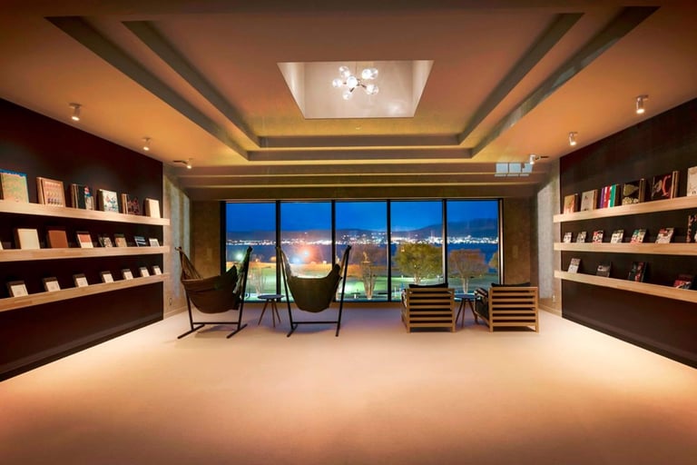 館内の各フロアにはレイクビューのラウンジがあり、片倉家の歴史に触れられる空間やフリードリンクコーナーを設置。