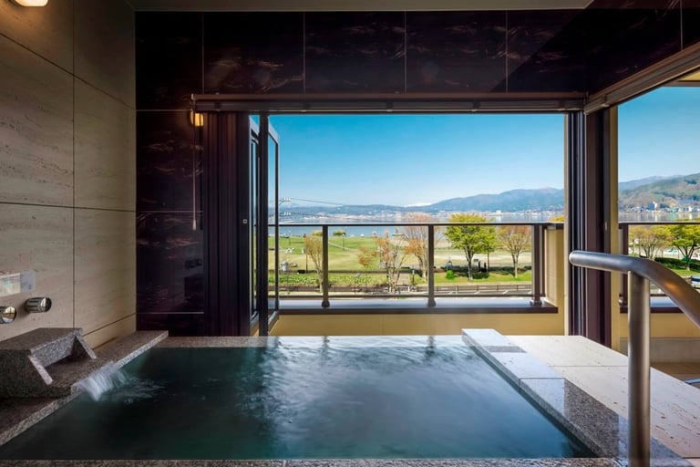 トラディショナルでシルクを感じさせる2F客室、モダンスタイルがテーマの3F客室は、全て設えが異なる9タイプ。また、全客室に源泉かけ流し露天風呂が付く贅沢さ。諏訪湖を眺められるプライベート空間で、好きなときに好きなだけ温泉が楽しめます。