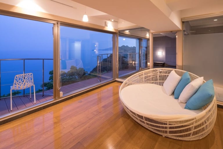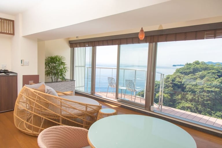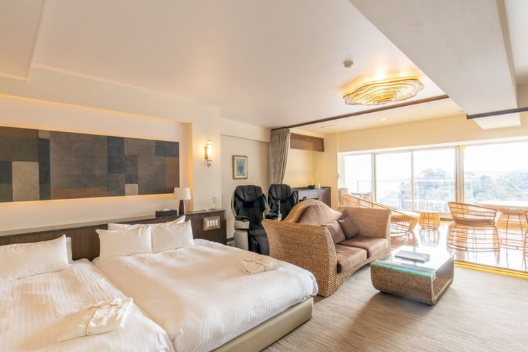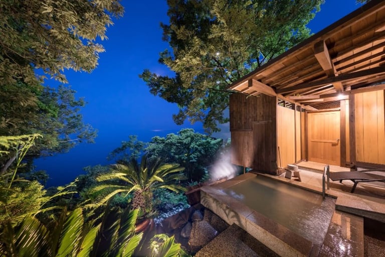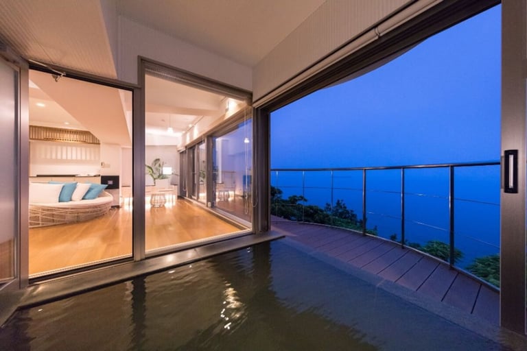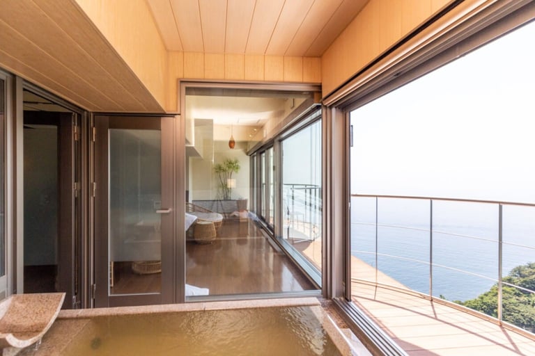 岩盤浴付きのラグジュアリー・スイートは、壮大な相模湾を一望できる最上階に位置。岩盤浴ルームでは日々の疲れを忘れ、心身ともに癒されること間違いなし。プレミアム・スイートにある屋外源泉かけ流し風呂は、太平洋の風を感じながら絶景を満喫できる最高の贅沢。どちらも1日1組限定の特別室です。