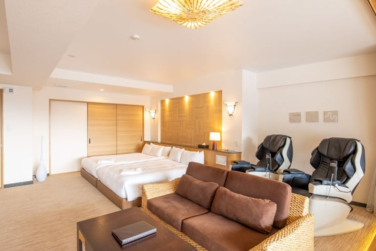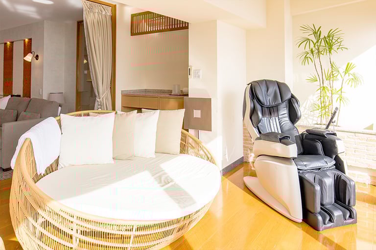 また、ふたり並んで使えるようにと全室にマッサージチェアを2台完備。「ぐっすりと快適な睡眠を」という想いから、柔らかい枕、硬めの枕、そば殻まくらなど様々な種類を用意している細やかな心配りも。