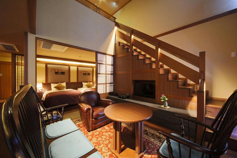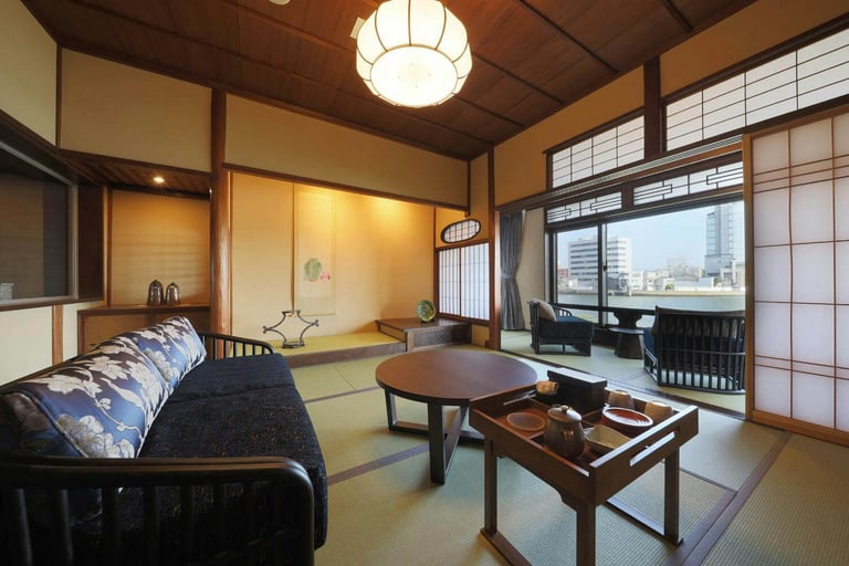全19室の趣あふれる客室は、伝統的な和の趣を大切にしつつ、モダンな家具や落ち着いた色合い。畳や障子、和紙を使ったインテリアが置かれ、どこか懐かしくも洗練された居心地のいい空間です。