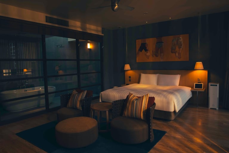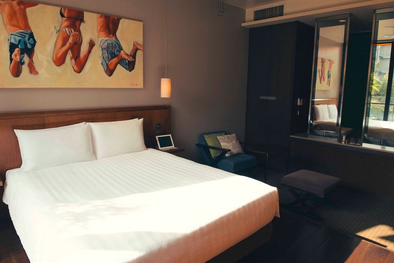 全16室のスイートルームは、どのお部屋もこだわりのインテリア、アート、音楽でお出迎え。シモンズ製のベッドが置かれ、スパークリングワインやコーヒーなど好みのドリンクを味わえるフリーミニバーも楽しめます。