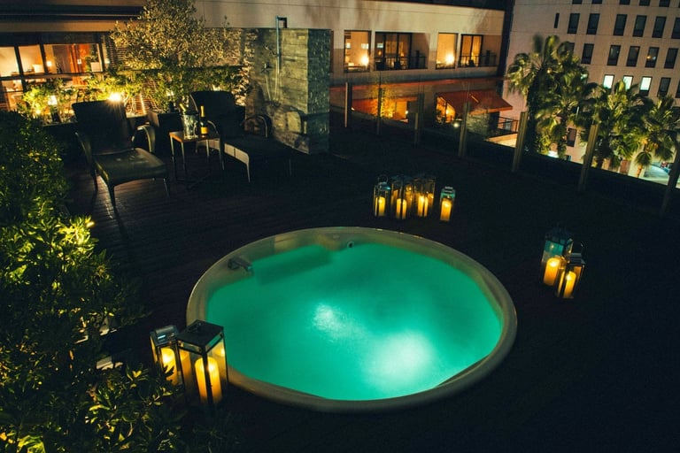 屋外テラスのスパジャグジーは、宿泊者限定で利用できる完全予約制。冷たいドリンク付きで24時間営業なので、昼は爽やかに太陽を浴び、夜は星空の下ライトアップされた空間で心身ともにリラックスできます。